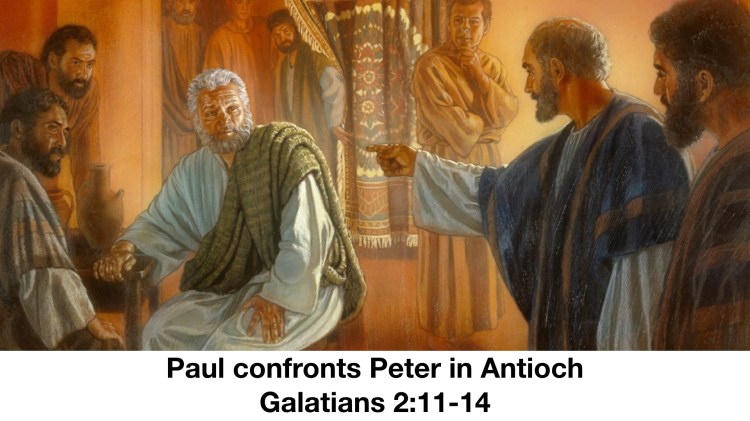 Paul confronts Peter in Antioch. That is the context of Galatians 2:11-14. Last week we looked at Galatians 2:1-10, where Paul travels to Jerusalem in defense of the gospel, the free gift of God given to both Jew and Gentile – achieved, worked for and given through the Lord, Jesus Christ. Jesus gave himself for us, for our forgiveness of sins so that we may be delivered from evil. Saved from the bondage of sin and death. And one of the images of the New Testament that warms my heart is Galatians 2:9 – where it reads “ “9 and when James and Cephas and John, who seemed to be pillars, perceived the grace that was given to me, they gave the right hand of fellowship to Barnabas and me, that we should go to the Gentiles and they to the circumcised. 10 Only, they asked us to remember the poor, the very thing I was eager to do.” (Galatians 2:9–10 ESV). Right there – In this meeting of these Four people – Paul, James, Cephas (Peter) and John – we have the entire New Testament except for the books of Matthew and possibly Hebrews (we do not know who wrote Hebrews, the author’s name is not given). There are more authors then these four – but the Gospel of Mark is written by Mark who followed Peter on his journeys, and the Gospel of Luke and Acts (written by Luke) was the travel companion of Paul, and the short book of Jude is connected to James. So here we have nearly the entire NT sitting at the table together praising the Lord and affirming the truth of the Gospel and a reminder to remember the poor. I love that image.