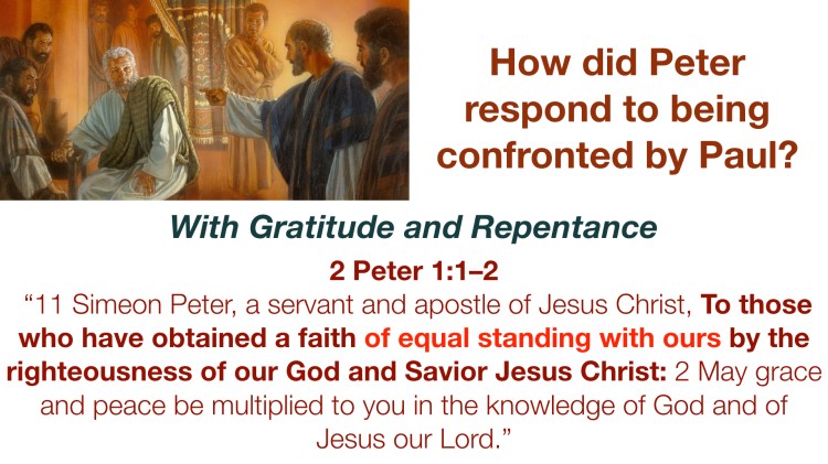 We are to be gospel people. Before closing I want to close the loop on Paul confronting Peter. How do you think Peter responded to Paul? I think Peter received Paul’s words with gratitude and that he was led to a right repentance. I base this on what Peter says in the opening of his letter, 2nd Peter. Notice how Peter begins his letter. Peter, the Jew, the great apostle of Jesus, writing to these churches full of gentile believers says; (2 Peter 1:1–2 ESV) “1 Simeon Peter, a servant and apostle of Jesus Christ, To those who have obtained a faith of equal standing with ours by the righteousness of our God and Savior Jesus Christ: 2 May grace and peace be multiplied to you in the knowledge of God and of Jesus our Lord.” Your faith is of equal standing to that of Peter’s by the righteousness of our God and Savior Jesus Christ. How is that possible, it is because we have the same gospel. Amen
