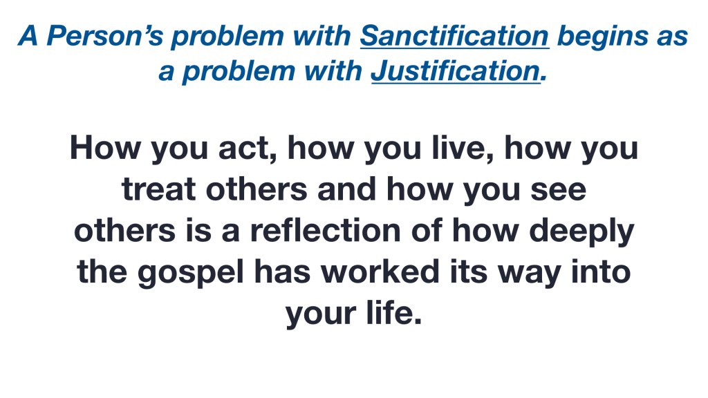 It has been said – that a person’s problem with sanctification (living a life that is holy and pleasing to God) begins as a problem of justification (which is recognizing that accepted by God because of who Jesus is and what he has done). How you act, how you live, how you treat others and how you see others is a reflection of how deeply the gospel has worked its way into your life. Those longings of the soul,