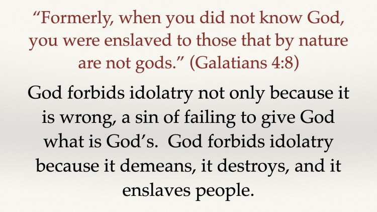 “8 Formerly, when you did not know God, you were enslaved to those that by nature are not gods.” Paul is speaking about the enslavement that happens under idolatry. The bondage of idolatry is a crucial understanding found in all of scripture. God forbids idolatry not only because it is wrong, a sin of failing to give God what is God’s. God forbids idolatry because it demeans, it destroys, and it enslaves people.