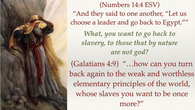 Our scripture today is Paul is doing the same head slap regarding the churches of Galatia. What, you want to go back to slavery, to those that by nature are not god? The people in the churches of Galatia came to Christ as gentiles, pagans, people who were once held in bondage to idols. Again, idolatry is not just the worship of a figurine but is what that figure represents.