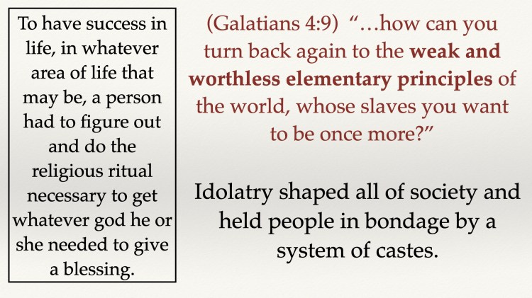 There was also idolatry on a social level. In verse 9, Paul asks the question, 9 But now that you have come to know God, or rather to be known by God, how can you turn back again to the weak and worthless elementary principles of the world, whose slaves you want to be once more?” The elementary principles of the world are a description of how people understood the ordering of life. Idolatry was not just a personal faith, but a represented the whole nation functioned. For God to bless this nation, think Rome here, the people of that nation had to perform the right ritual to the gods. And proper ritual included the ordering of society. Slaves had to be kept slaves; women had to be kept in their place; those of noble birth must be kept clean of those of ignoble birth. Idolatry shaped all of society and held people in bondage by a system of castes. A caste system is the natural result of national idolatry. People who worship idols believed that for gods to bless a nation right ritual included a caste system. The elementary principles of the world that not only controlled personal and private life but also controlled the very nature and fabric of society.