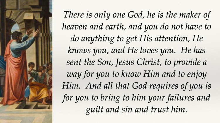 The Gospel: Thus, you can imagine how powerful the Gospel must have been when preached to people who were enslaved, literally, and spiritual, into this system of idolatry. Here is the Gospel. There is only one God, he is the maker of heaven and earth, and you do not have to do anything to get his attention, he knows you, and he loves you. He has sent the Son, Jesus Christ, to provide a way for you to know him and to enjoy him. And all that God requires of you is for you to bring him your failures and guilt and sin and trust him. Many people, men and women, rich and poor, slaves and free, did that very thing, they trusted God and put their faith in Jesus Christ. When they did this (responded to the Gospel by faith), their lives changed. No longer were they under the bondage of heart and mind, but they were also freed from the caste system created by idolatry. We see this freedom in the words of Paul at the end of chapter 3. “There is neither Jew nor Greek, there is neither slave nor free, there is no male and female, for you are all one in Christ Jesus.” (Galatians 3:28 ESV). When people stopped worshiping idols, it was not just a personal liberation but also a social one as well.