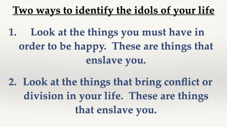 - 2. Look at things in your life that bring conflict and division. When people argue or fight over something, there is probably an idol in that conflict somewhere.