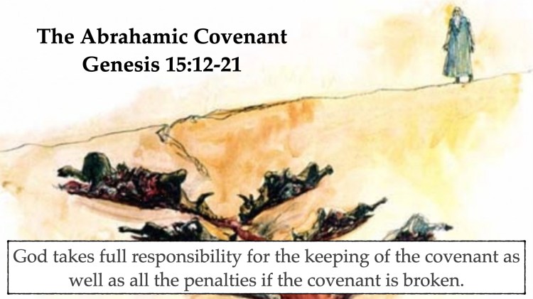The making of the Abrahamic Covenant is unique, though, because God alone walks the path between the slaughtered animals. You can read about it in Genesis 15:12-21. The image that scripture gives us is that of God walking that path between the sacrificed animals alone. The meaning of God doing this alone is that he, the Lord himself, takes on all of the responsibilities and all the penalties of the covenant. The other party, Abraham, will be a recipient of the covenant through no effort of his own. It would be like going to buy a house, and as you sat down to sign all the mortgage papers for the loan, another person steps in and signs them all for you, and says, “The house is yours; I will take care of everything.” When God makes this covenant with Abraham in Genesis 15:12-21, that is what is happening. God takes full responsibility for the keeping of the covenant as well as all the penalties if the covenant is broken.
