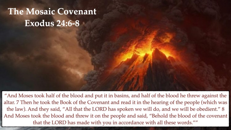 That is the first half of the story that Paul turns into an allegory. The second story that Paul adds to his allegory is the covenant that God makes at Mount Sinai with the people of Israel, often called the Mosaic Covenant. The covenant at Mount Sinai, the story of Moses, and the people of Israel, and the giving of the law, is made differently than the covenant with Abraham. Remember, in the covenant with Abraham, God alone takes full responsibility for fulfilling the covenant and any penalties if the covenant is not fulfilled, not so at Mount Sinai. In Exodus 24, the covenant is made. Animals are sacrificed, and Moses takes half of the blood from these sacrifices and throws it against the altar. This is a way to signify God’s signing the covenant, so to say, “Yes, I promise to be with you, and go before you, and to protect you, and to bring you into the land of milk and honey.” The blood thrown on the altar is his signature. Then Moses turns to the people saying, “You all need to sign it too.” Reading this in Exodus 24:6-8, “And Moses took half of the blood and put it in basins, and half of the blood he threw against the altar. (That was God’s signature) 7 Then he took the Book of the Covenant and read it in the hearing of the people (which was the law). And they said, “All that the LORD has spoken we will do, and we will be obedient.” 8 And Moses took the blood and threw it on the people and said, ‘Behold the blood of the covenant that the LORD has made with you in accordance with all these words.’” By the blood thrown on them, the people sign the covenant promising that they agree to keep the law and accept all the curses outlined in the law if they do not. Which promise, as we all know, lasted for about a week, but that is another story. Let us stick to the allegory given to us.