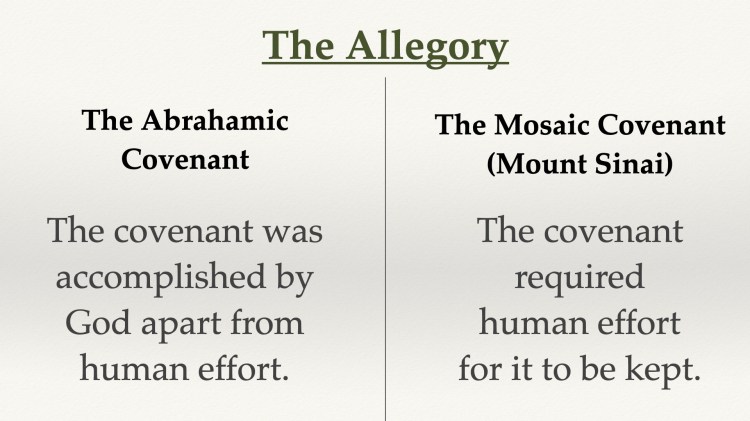 How these two different covenants were made is a major factor in understanding the allegory. The first covenant, the covenant of promise where God pinned Abraham to the ground, was a covenant accomplished by God apart from human effort. The second covenant at Mount Sinai, where blood is thrown on the people, is the covenant that required human effort to keep, something that human effort could not do.