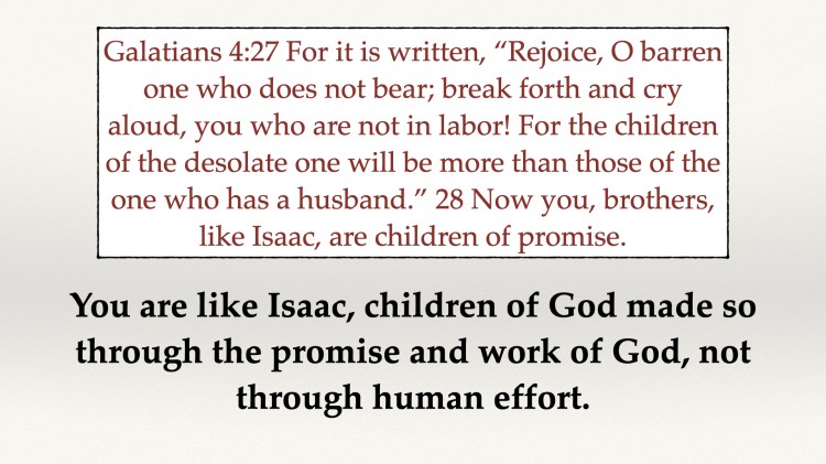 That is not the covenant we have received in Jesus Christ. The covenant we have received in Christ is like the covenant made with Abraham, where the responsibility and the penalty fall upon God alone. It is here that Paul quotes Isaiah 54, tying this ancient promise given to Abraham and Sarah to the fulfillment of God’s promises found in Christ. Galatians 4:27 “For it is written, “Rejoice, O barren one who does not bear; break forth and cry aloud, you who are not in labor! For the children of the desolate one will be more than those of the one who has a husband.” 28 Now you, brothers, like Isaac, are children of promise.” This passage of Isaiah that he quotes points us to a whole section of scripture that is all about the new covenant in Jesus Christ, the suffering servant who takes the sins of the world upon Himself. You, Paul says, are like Isaac, children of God made so through the promise and work of God. Not through human effort. “31 So, brothers, we are not children of the slave but of the free woman. 1 For freedom Christ has set us free; stand firm therefore, and do not submit again to a yoke of slavery.”