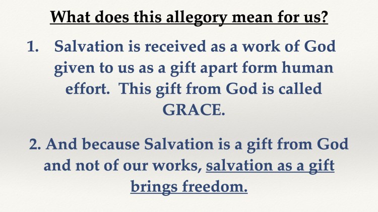 How does this allegory apply to us? First, the simplest and clearest application of this allegory is that salvation is received as a work of God given to us as a gift apart from human effort. This gift from God is called grace. We are saved not by our works, not by our efforts, but by grace through faith apart from human effort. Salvation does not come from our own doing, but it a gift from God. And because it is a gift from God and not of our works, salvation as a gift brings freedom.