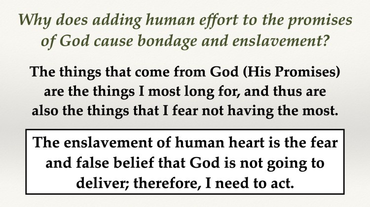 Why? Why does adding human effort to accomplishing the promises of God bring bondage and enslavement? I thought a lot about this, and I think there are a lot of answers, much more than I am giving here, but I am preaching to myself, and this is what I need to hear, and thus I am sharing it with you.
