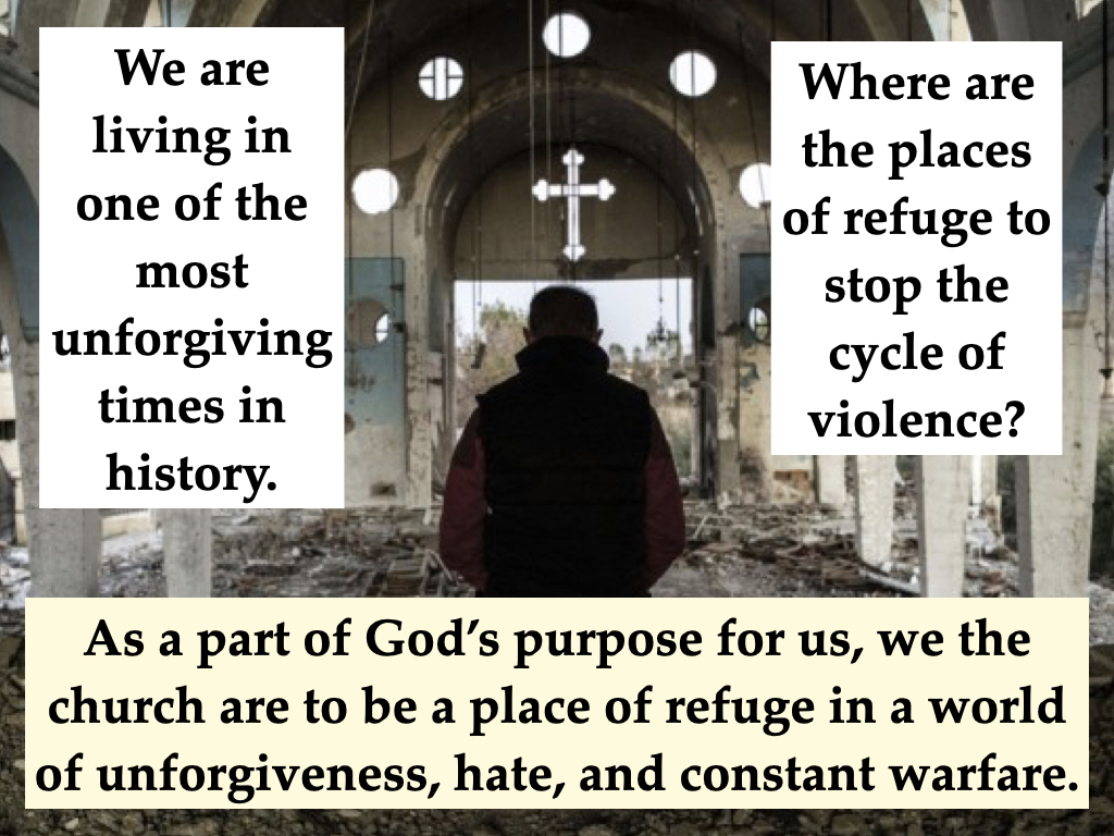 It seems to me that we are living in one of the most unforgiving times in history. With the creation of the internet and social media, there has been a meanness and hatefulness that has taken hold of our culture. We are eating ourselves alive. If a person says something wrong, voices a politically or culturally incorrect opinion, or just has the wrong view of things, there is a risk of being ostracized, excommunicated, shut down, and maybe violently harmed. Political tribes are at war with each other. The generational groupings (Boomers, and Generation X, Millennials, and iGen) belittle those outside their group. There are class warfare and cultural wars. There is no quarter given to people who have committed either real sins or perceived ones. As a nation, and as a people, we are eating ourselves alive. Where are the places of refuge? Where does the cycle of violence stop today?