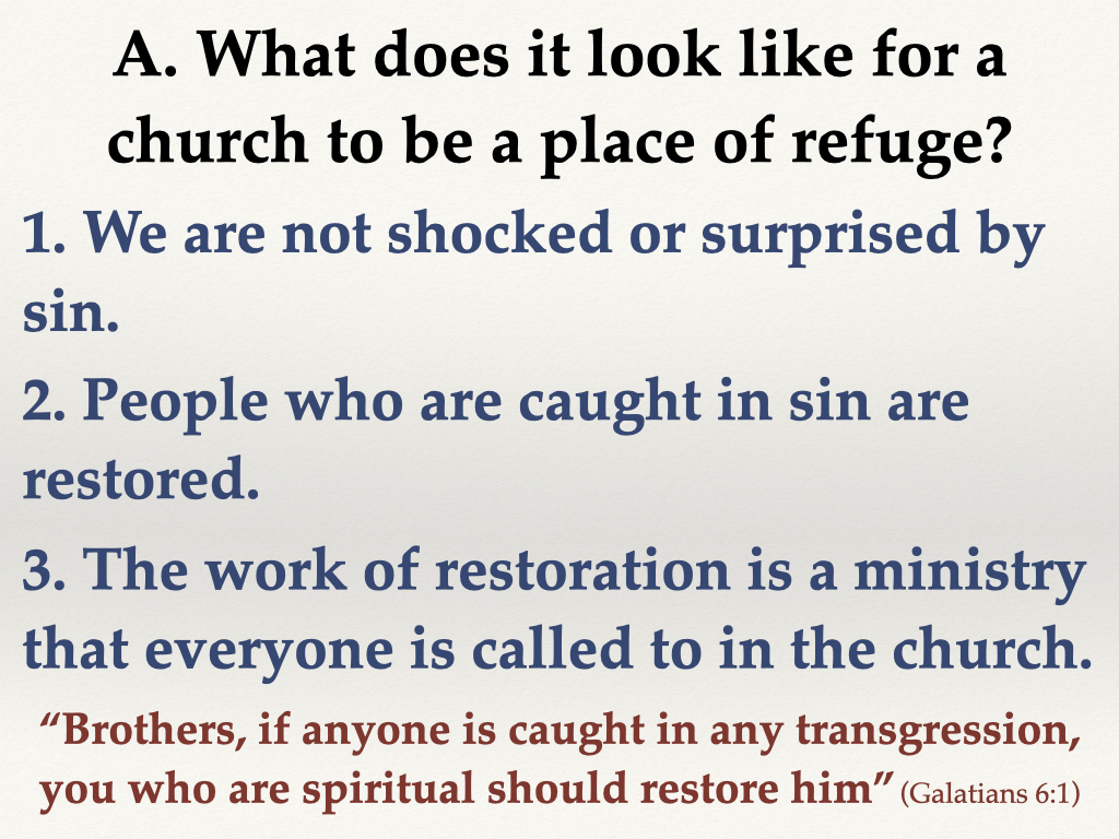Our scripture today, Galatians 6:1-2, shows us (1) what it looks like to be a place of refuge and (2) how it is done. These two points are the focus of this message.