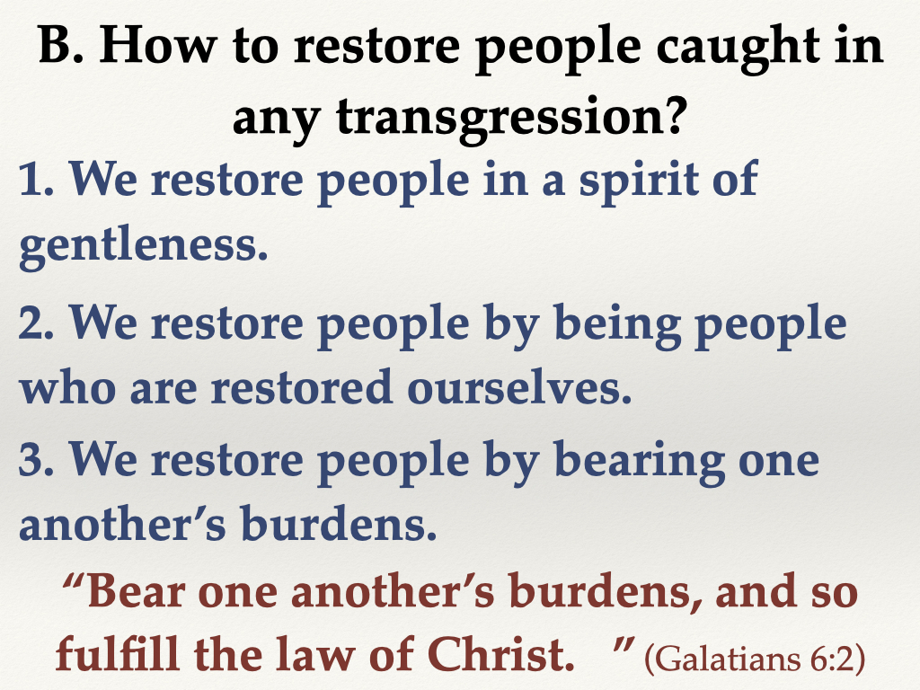 The ministry of restoring people belongs to all who are filled with God’s Spirit. The world needs places of refuge today. The world needs the church. The next point (point B) is looking at HOW the people of the church do this ministry of restoration.