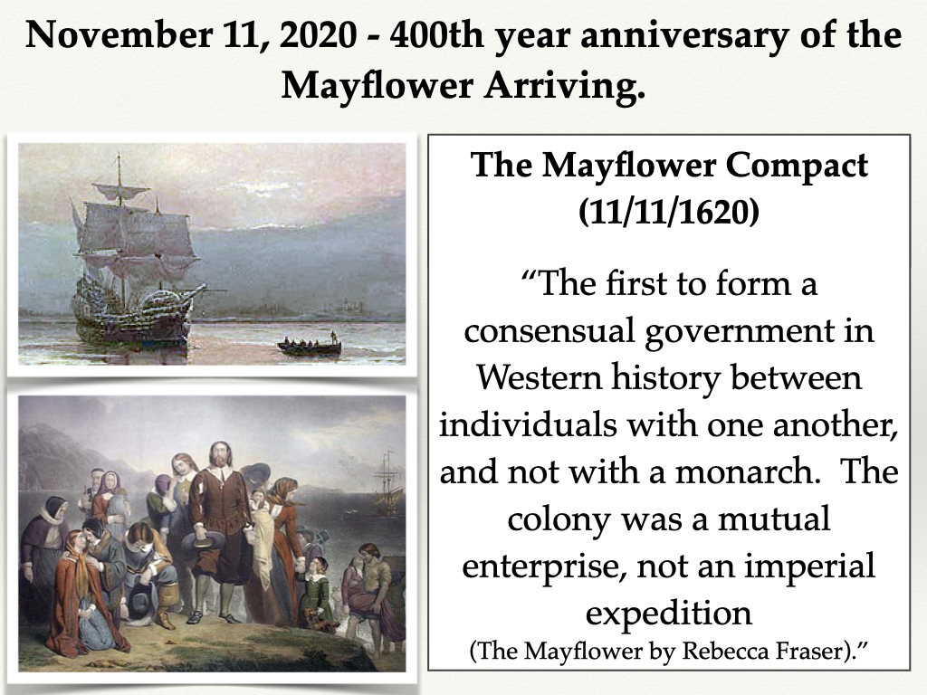 (The 400th Anniversary of the Mayflower) 2020 is a special year. I do not know if you know it or not, but today (November 11) is the 400th anniversary of the Mayflower arriving in the New World with a group of passengers known as Pilgrims. These pilgrims were puritan separatists who suffered persecution in England and sought a land where they could worship freely. This desire drove them to establish a colony in the land we call America today. They set sail in September of 1620 and dropped anchor near the tip of Cape Cod, Massachusetts, on November 11, 1620. They were not the first to come to this land, nor would they be the last, but what made this group of people so unique is that they were “the first to form a consensual government in Western history between individuals with one another, and not with a monarch. The colony was a mutual enterprise, not an imperial expedition (The Mayflower by Rebecca Fraser).” They wrote and signed the first constitution that was democratic and acknowledged liberty under law, giving people the right to participate in government.