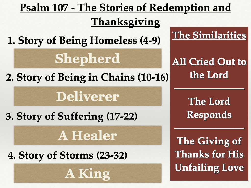 Did you catch how each story is similar? In each of the four stories, there was a turning point when “they cried out to the LORD in their trouble, and he brought them out of their distress.” To those who were homeless, the Lord responded as a shepherd to guide them home. To those in prison and held captive, the Lord responded as a deliverer who set them free. To those suffering and afflicted, the Lord responded as the healer who rescued them from the grave. To those caught in the storm, the Lord responded as the King that could calm the storm with but a whisper. At the end of each story, the people give thanks to the Lord. Reading again, verse 31, “Let them give thanks to the LORD for his unfailing love and his wonderful deeds for men.”