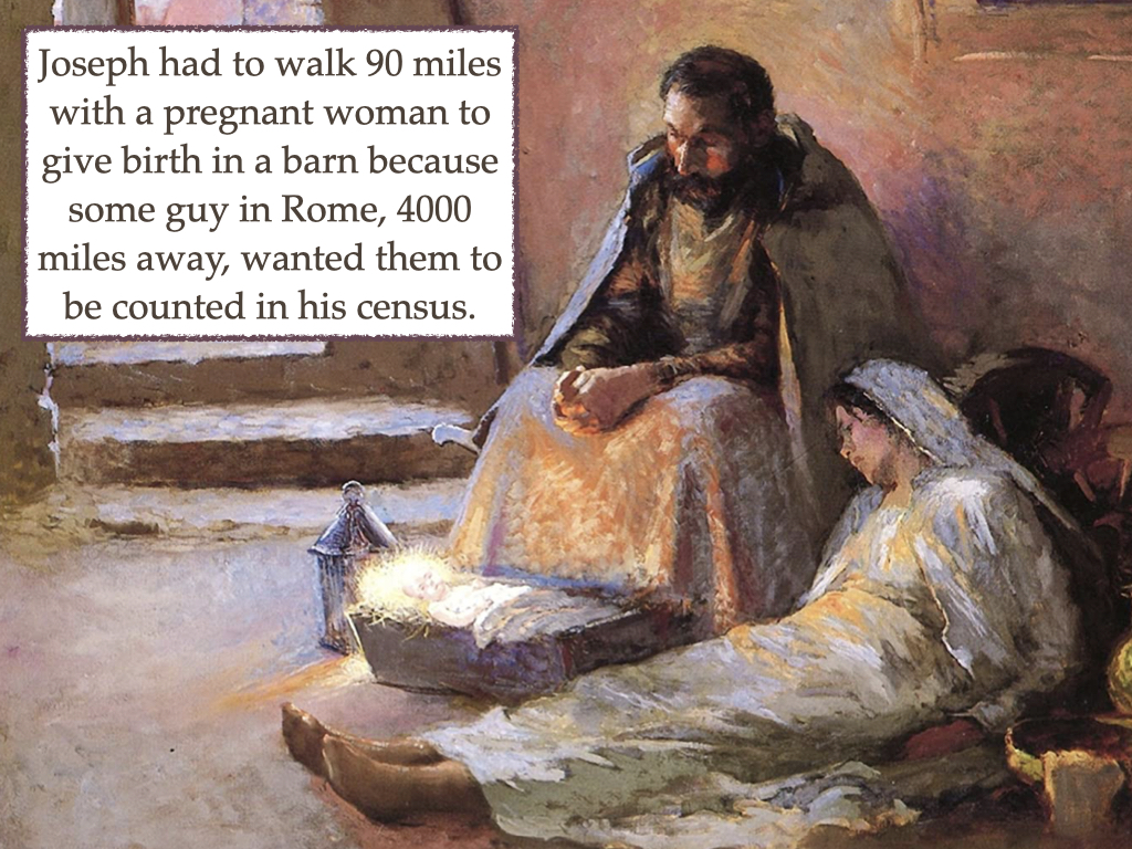 This is very shocking, and it makes me angry. How can there not be a place for a woman about to give birth? Either people know that Mary is pregnant out of wedlock and thus don’t want her staying at her house due to any stigma her presence may bring, or Joseph and Mary are so poor that no one was willing to be inconvenienced for what little they could pay. I think that we can accurately suppose that if Mary and Joseph had money, there would be a room found in the inn. Thus, Mary and Joseph are sent to the barn where Jesus is born, wrapped in cloths, and placed in a feeding trough. Was this barn a part of the house, as some suggest? Maybe. Or was the barn a cave used to shelter animals on cold nights? Maybe. I do not know. Both are possible. The point is that Joseph had to walk 90 miles with a pregnant woman so that she could give birth in a barn because some guy in Rome, 4000 miles away, wanted them to be counted in his census. Caesar’s obscene power turned Mary and Joseph into just numbers to be counted. He did not know them, and he, for sure, did not care about them, yet his decree brought hardship to their lives as well as to thousands of other lives.