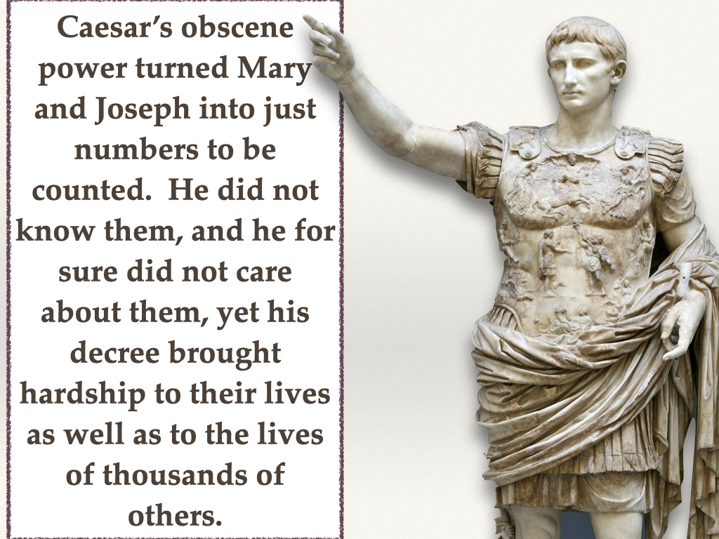 Have you ever thought about how obscene was the power of Caesar Augustus? The description of Jesus’ birth in the Gospel of Luke begins with a man, the emperor of Rome, decreeing that a census is to be taken of people he has never seen, nor will ever meet. Luke 2:1-7 reads, “1 In those days a decree went out from Caesar Augustus that all the world should be registered.” “2 This was the first registration when Quirinius was governor of Syria. 3 And all went to be registered, each to his own town. 4 And Joseph also went up from Galilee, from the town of Nazareth, to Judea, to the city of David, which is called Bethlehem, because he was of the house and lineage of David, 5 to be registered with Mary, his betrothed, who was with child.” 6 And while they were there, the time came for her to give birth. 7 And she gave birth to her firstborn son and wrapped him in swaddling cloths and laid him in a manger, because there was no place for them in the inn.”