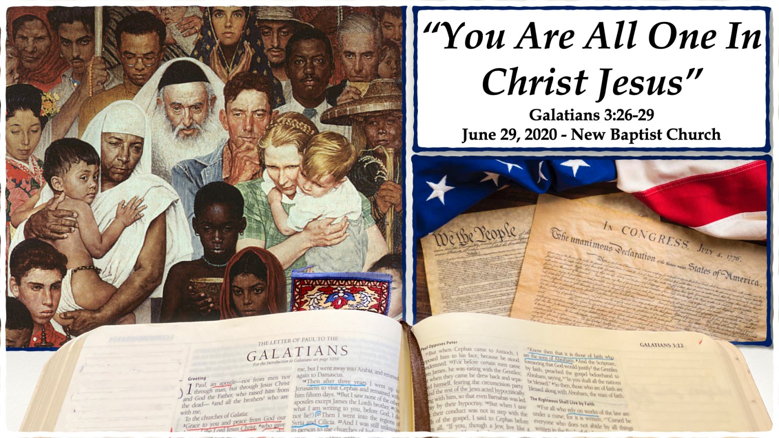 Our scripture today is the end of the 3rd chapter of Galatians, Galatians 3:26-29. Since Easter we have been in the book of Galatians on this Sunday before the 4th of July we come to a very important passage that needs to be heard. I am going to read this passage, and then will go into an introduction ofContinue reading ““You Are All One in Christ Jesus” (Galatians 3:26-29)”
