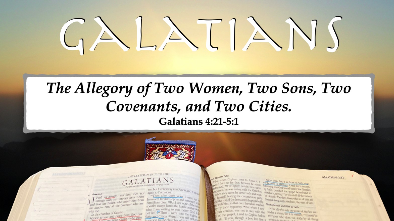 In Galatians 4:21-5:1, Paul does something that he very rarely does; he uses allegory. Allegorical interpretation of scripture is not normative for Paul, and for that matter, should not be normative for us. An allegorical interpretation is when a story becomes a symbol that represents something else. The Lion, the Witch, and the Wardrobe is an allegory by C.S.Continue reading “The Allegory of Two Women, Two Sons, Two Covenants, and Two Cities (Galatians 4:21-5:1)”